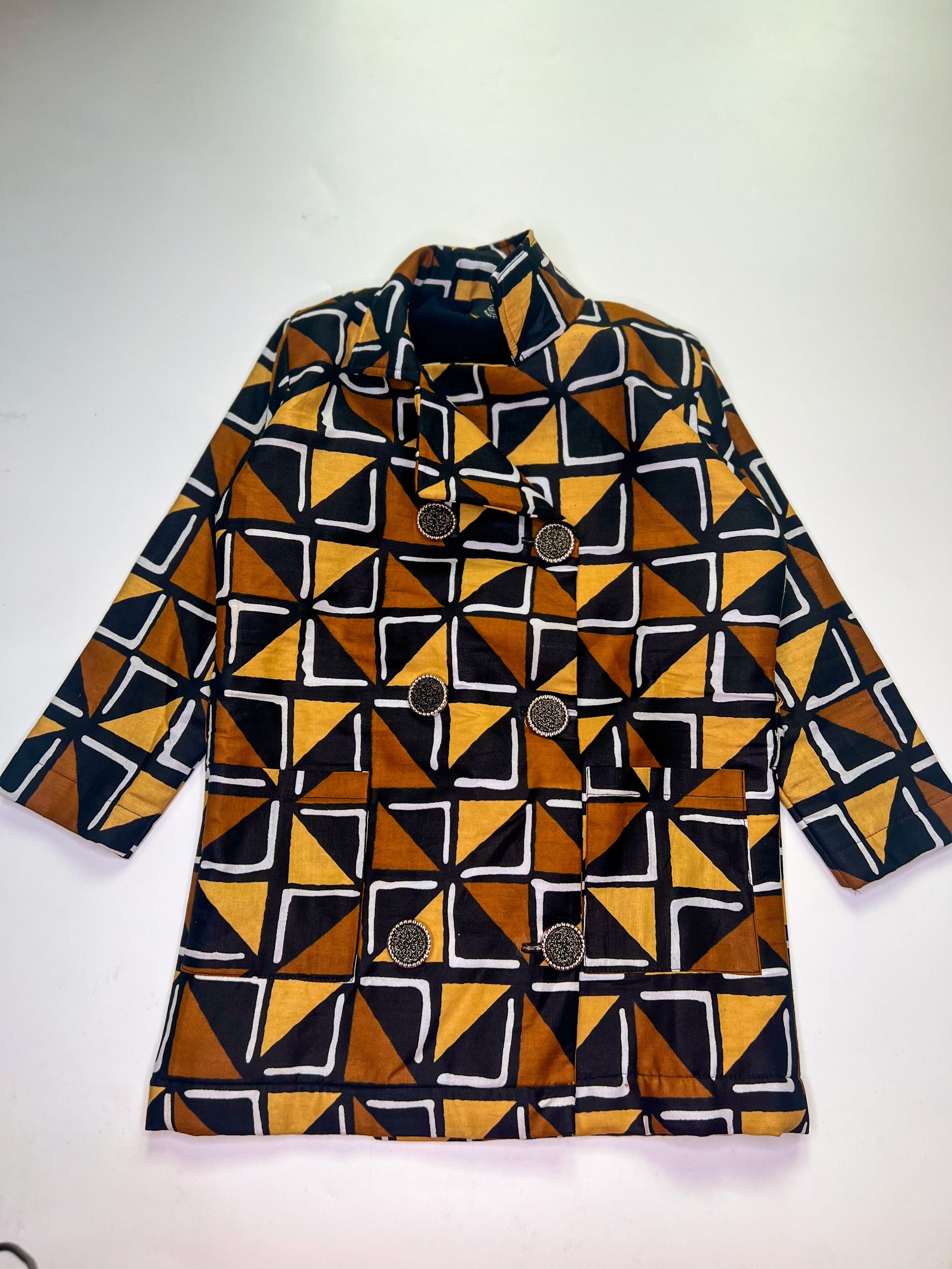 This streamlined jacket with military button detail gives a timeless sophistication for your little one.With the bright fabric patterns made from100% cotton Ankara but lined to combat the cooler days