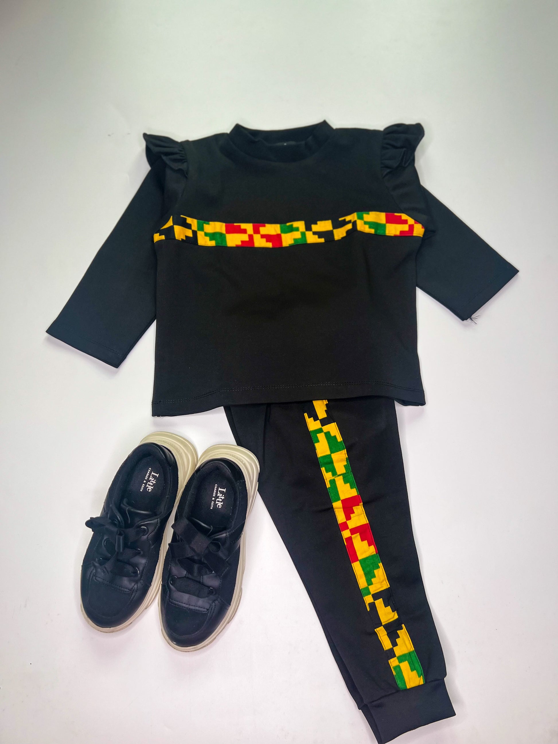 This cotton blend Joggy set with flare shoulder details for the girlie addition to contemporary athleisure .Kente Stripe is made from 100% cotton.
